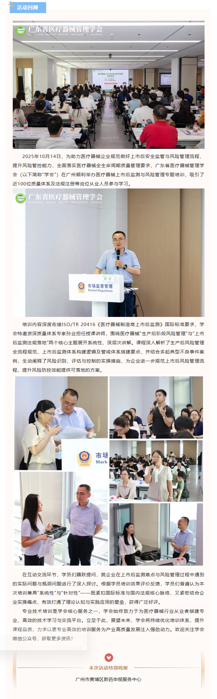 医疗器械上市后监测与风险管理专题培训顺利举办
