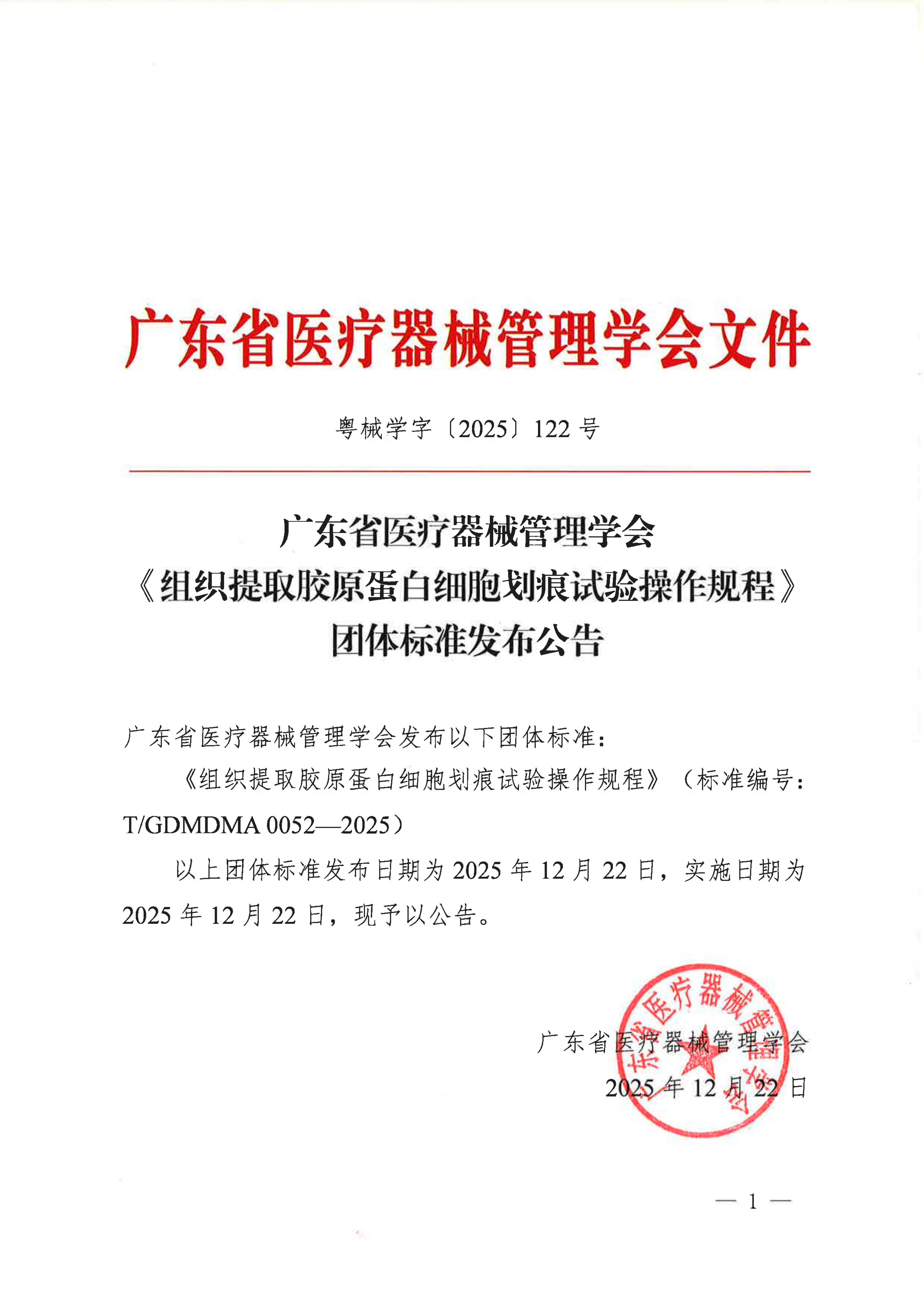 2025年12月22日,广东省医疗器械管理学会(以下简称学会)团体标准《组织提取胶原蛋白细胞划痕试验操作规程》(T/GDMDMA 0052—2025)正式发布并实施。